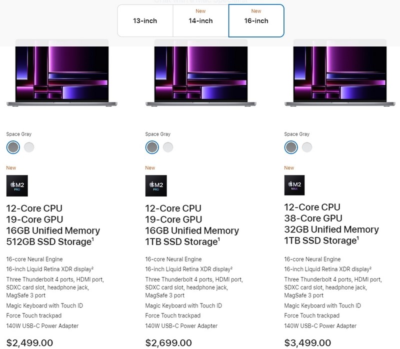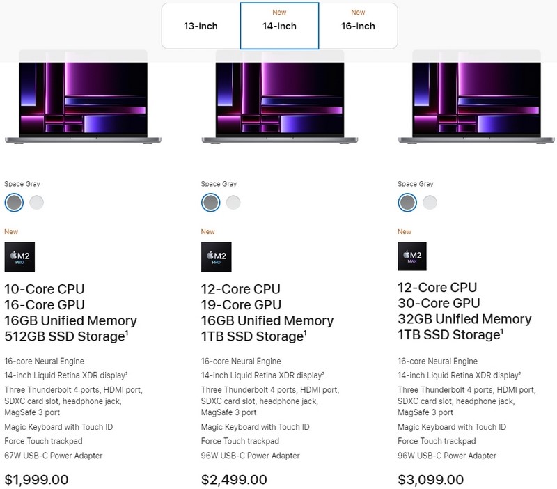 წარმოდგენილი MacBook Pro-ებიდან ყველაზე დაბალფასიანი მოდელი შეფასებულია 1999 აშშ დოლარად, ამ ფასად მომხმარებელი მიიღებს 14-დუიმიან ვერსიას custom-იზებული Apple M2 Pro ჩიპით (10-ბირთვიანი CPU და 16-ბირთვიანი GPU), მას ექნება 16 გბ ოპერატიული მეხსიერება და 512 გბ SSD. 16-დუიმიანი მოდელის ფასები იწყება 2499 აშშ დოლარიდან. მასაც აქვს M2 Pro ჩიპი, თუმცა 12-ბირთვიანი CPU და 19-ბირთვიანი GPU. M2 Max პროცესორის მქონე ყველაზე დაბალფასიანი MacBook Pro-ს (14 დუიმი) ფასია 3099 აშშ დოლარი, ყველაზე ძვირადღირებულის - 6499 აშშ დოლარი (16-დუიმიანი მოდელი, მეხსიერებისა და პროცესორის მაქსიმალური კონფიგურაციით).