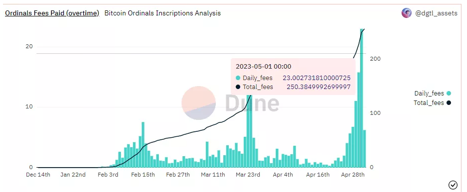 სტატიის წერის მომენტისთვის პლატფორმა Dune Analytics-ზე @dgtl_assets დეშბორდის მიხედვით სულ 3130802 bitcoin-NFT გაიცა. მათ გამოშვებაზე საკომისიოს სახით დაიხარჯა 2566132 BTC (7.2 მლნ აშშ დოლარი).