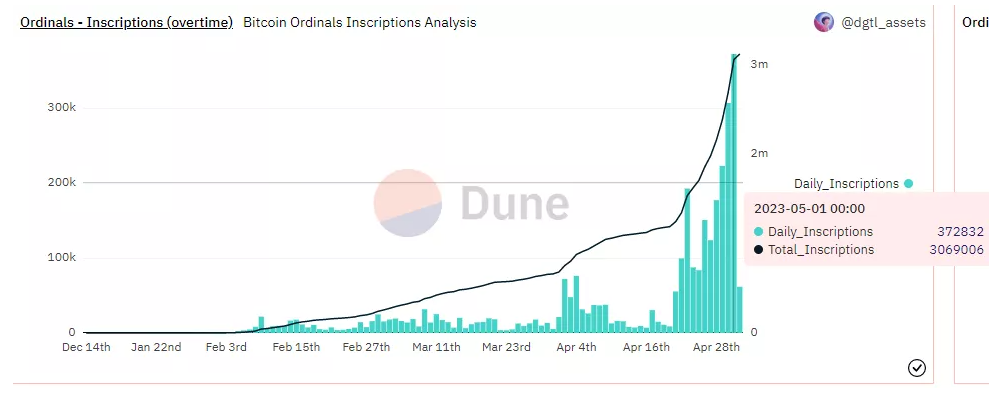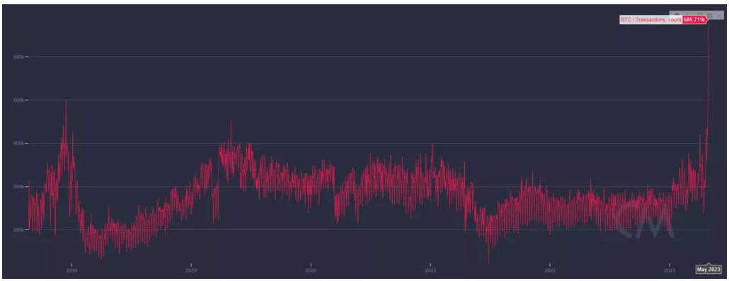 1 მაისს Bitcoin-ის ქსელში ტრანზაქციების ყოველდღიურმა მოცულობამ მიაღწია ATH 685.711-ს Ordinals-თან დაკავშირებული აქტივობის ზრდის ფონზე.