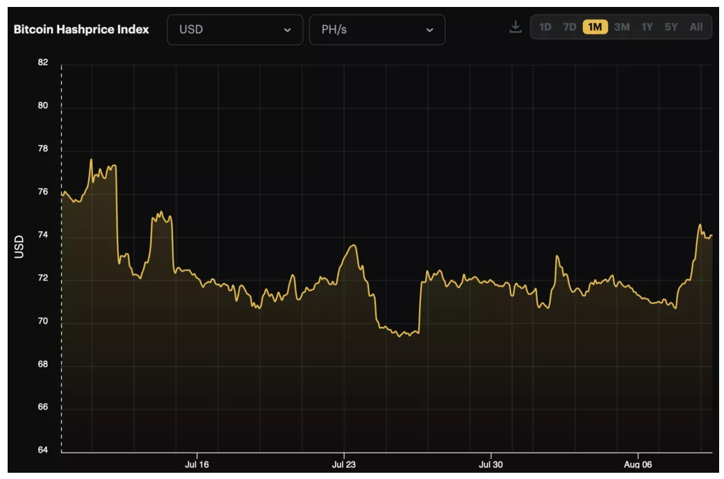 Hashrate Index-ის მიხედვით ბოლო 24 საათის განმავლობაში ჰეშის ფასი გაიზარდა 3%-ით - 72.3 აშშ დოლარიდან დღეში 74 დოლარამდე PH-ზე.