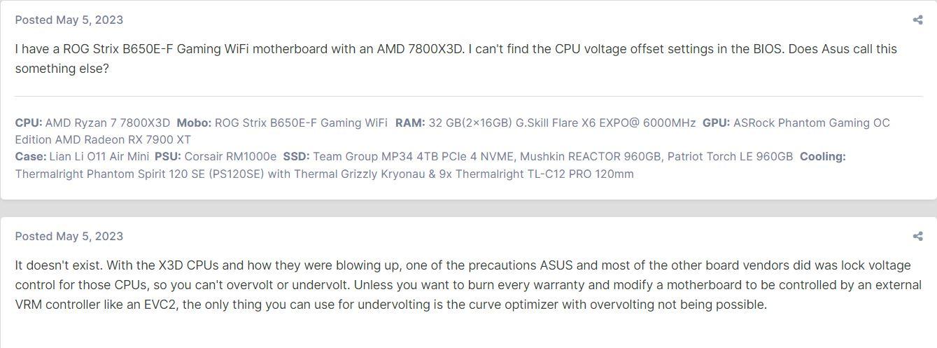 George Posted February 10, 2024 Posted February 10, 2024 ესე იგი არ დაუმატებიათ მაგ მოდელის ბიოსში, თორე მაგ კაცს აქვს 7900X-ზე აშკარათ, იმენა tweaker paradise ქვემოთაა сpu core voltage, კონკრეტულათ მაგ X3d მოდელზე არაა როგორც ჩანს მაგ მოდელზე, სხვა მოდელებზე რა ხდება არ ვიცი უფრო სერიოზულებზე, იქ შეიძლება იყოს, პროცესორის თემაა ეტყობა X3D, შემცირებული რაზგონის პოტენციალი აქვს ექსტრა კეშის გამო და თავიდან ქონდა შეზღუდვები, მერე თითქოს გაუხსნეს რაზგონი შემდგომ ბიოსებში, როგორც ჩანს მაგ ასუსზე არ დაუმატებიათ ეგ სეთინგი მაგ პროცესორისთვის,. ისე შენი მაზერი ცუდი რეპუტაციით სარგებლობდა, სულ თავიდან რომ გამოვიდა ეგ პროცესორი რამდენიმეს დაეწვა, ბიოსი მაღალ ვოლტაჟს აძლევდაო აუტოზე ხოდა გადიოდა გაღმა პროცესორი, მაგის შემდეგ დაფიქსეს ეგ პრობლემა ბოლო ბიოსებზე, ხალხი ხმარობს მაგ პროცესორზე და კარგათ მუშაობსო რავი, აი ლაინუსის ფორუმზე რა უწერიათ მაგასთან დაკავშირებით: It doesn't exist. With the X3D CPUs and how they were blowing up, one of the precautions ASUS and most of the other board vendors did was lock voltage control for those CPUs, so you can't overvolt or undervolt. Unless you want to burn every warranty and modify a motherboard to be controlled by an external VRM controller like an EVC2, the only thing you can use for undervolting is the curve optimizer with overvolting not being possible. ანუ ასუსმა თავი დაიზღვიაო და ზოგიერთმა სხვა ბრენდებმა ლიმიტი დაადესო ვოლტაჟის, როგორც ჩანს ასუსმა ვაბშე დაიკიდა ეგ ამბავი, იწვებოდა თურმე ხოშიანათ მაგის გამო, მარტო ანდერვოლტიო ერთი სიტყვით, сpu core-ზე ვოლტაჟის გაზრდა არ გამოვაო X3D-ზე, მეეჭვება X670 მანდ გიშველოს დიდათ, თუმცა სადმე შეიძლება ქონდეთ გახსნილი, მაგრამ მემგონი ჯობია შეეშვა, იწვება ადვილათ და მაგიტომ მაღალ ვოლტაჟზე ეგ მოდელი The problem, I believe is that the 7800x3d is HARD voltage limited. It won't go over 1.2v on the core. It's also HARD limited to 5050mhz maximum. I don't see the same issue specifically as you guys, in that I can hold 5ghz all core in Cinebench, with a fairly hefty negative offset. But there's no way of getting over that without a ECLK overclock, which your board won't do. So ultimately, if the CPU can hit either get voltage limited at 1.2v or hit 5.05ghz without using more than 60w, it won't use more than 60w. არა მარტო მაგ ასუსის მოდელზე, ბევრზე შეგხვდება ეგეთივე სიტუაცია აბსოლიტურათ ყველაზე თუ არა, მარტო რამდენიმეს ქონდეს შეიძლება გახსნილი ეგ, ეგეც შეიძლება, არ ვიცი იქნება ყველაზე დაბლოკილია ვოლტაჟის ამწევი X3D მოდელებზე ცალკე, მაგრამ რამს ეგ დიდათ არ უნდა ზღუდავდეს, მაგაზე შეგიძლია ცალკე ეჩალიჩო კიდე რამე თუ ვერ მოიყვანე ჯერ ფორმაში, ისე მართლა საინტერესოა, პროცესორი რეალურათ 60-70 ვატზე უბერავს თურმე და სერიოზულათ ხურდება უკვე Cinebench R23 80 გრადუსს ცდებაო,ანუ საკმაოთ ცხელი პროცესორია მიუხედავათ იმისა რომ ძალზე სწრაფია და ცოტა ვატებს ჭამს ინტელთან შედარებით