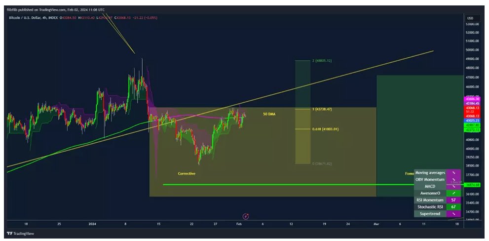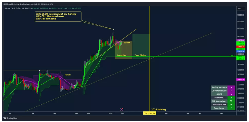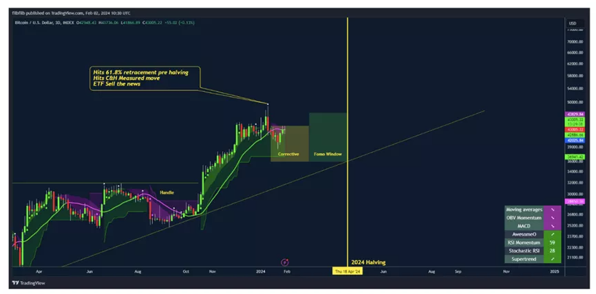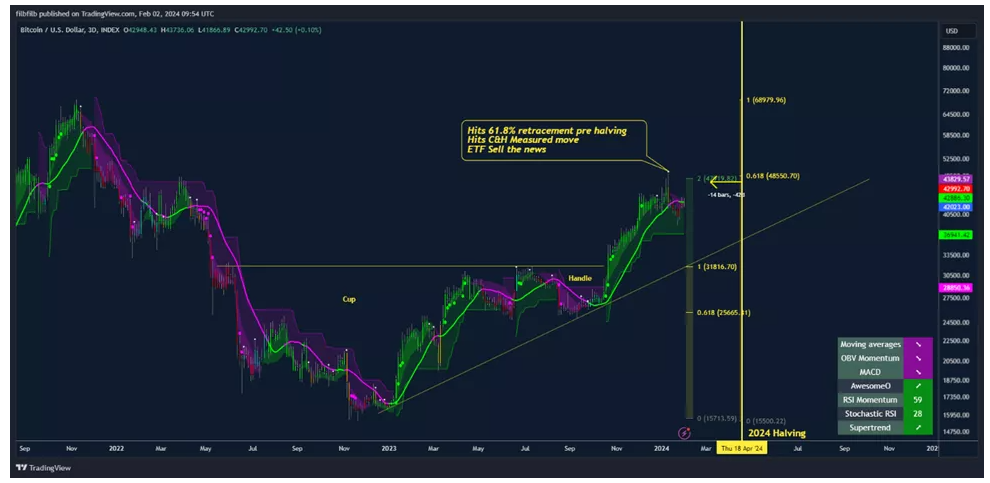ექსპერტების აზრით სანამ მაინერებისთვის ჯილდო განახევრდება Bitcoin-ის ფასი შეიძლება გაიზარდოს 49 ათას აშშ დოლარამდე (61.8% ფიბონაჩის კორექცია შემცირების ტალღიდან ისტორიულ მაქსიმუმამდე).