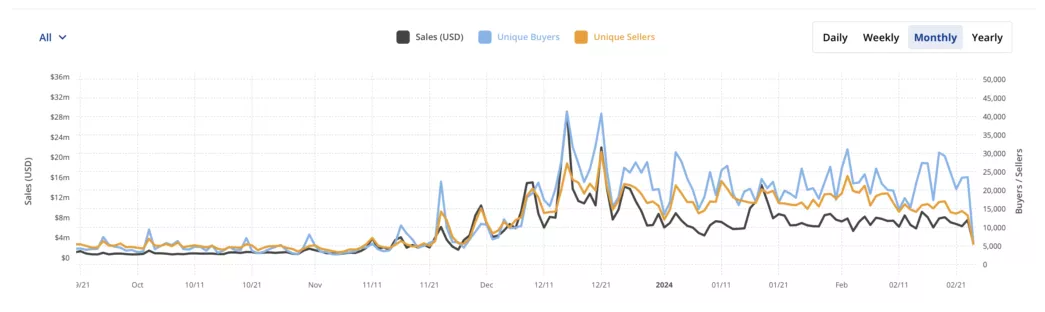 Magdalena Posted February 27, 2024 Posted February 27, 2024 CryptoSlam-ის მონაცემებით Solana-ს ქსელში არაურთიერთჩანაცვლებადი ტოკენების (NFT) გაყიდვების მოცულობამ 5 მლრდ აშშ დოლარს მიაღწია საანგარიშო პერიოდის განმავლობაში, აქედან 217 მლნ აშშ დოლარი მოდიოდა ბოლო 30 დღეზე. წყარო: CryptoSlam. 2023 წლის დეკემბერი იყო Solana-ზე NFT-ების გაყიდვებით ისტორიაში მეორე ყველაზე მაღალი თვე 2021 წლის ოქტომბრის შემდეგ - 365 მლნ და 373 მლნ აშშ დოლარი, შესაბამისად. CryptoSlam-ის მონაცემებით, ქსელში დაფიქსირებულია NFT-ების 2.2 მილიონზე მეტი მყიდველი და 1.6 მილიონი გამყიდველი. NFT ტრანზაქციების საერთო რაოდენობამ 43 მილიონს გადააჭარბა. მაჩვენებლები გაიზარდა 2023 წლის ბოლოს კრიპტოვალუტა Solana-ს ფასის 118 აშშ დოლარზე მეტი ზრდის ფონზე. წერის დროს SOL ტოკენი 102 აშშ დოლარად იყიდება. CoinGecko-ს თანახმად პროექტის კაპიტალიზაცია 45 მლრდ აშშ დოლარს შეადგენს. SOL/USDT-ის საათობრივი გრაფიკი ბირჟა Binance-ზე. წყარო: TradingView. 2024 წლის დასაწყისში Solana-ს ბლოკჩეინზე ტრანზაქციების ყოველდღიურმა მოცულობამ 40 მლრდ აშშ დოლარს გადააჭარბა და 2022 წლის ოქტომბრის შემდეგ უმაღლეს დონეს მიაღწია. 6 თებერვალს ქსელში მორიგი ხარვეზი დაფიქსირდა. ექსპერტებმა ბლოკჩეინის მუშაობაში პერიოდული პრობლემების მიზეზად დაასახელეს მისი უუნარობა - გამკლავებოდა ტრანზაქციების მზარდ მოცულობას. http://tinyurl.com/bduwd8ym Quote