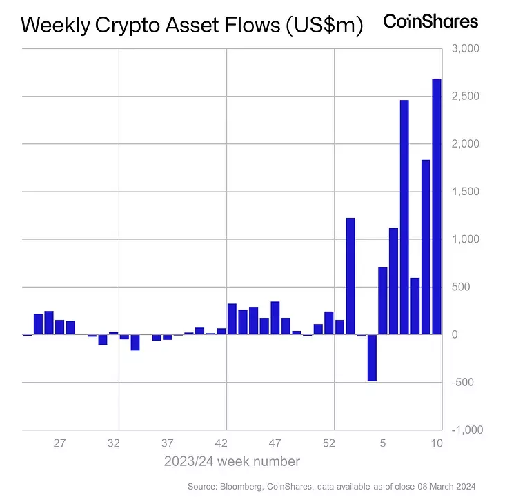 Magdalena Posted March 14, 2024 Posted March 14, 2024 კრიპტოვალუტების საინვესტიციო პროდუქტებში შემოსავალმა 2 მარტიდან 8 მარტამდე პერიოდში შეადგინა 2.69 მლრდ აშშ დოლარი წინა საანგარიშო პერიოდის 1.83 მლრდ აშშ დოლარის შემდეგ. ამის შესახებ ნათქვამია CoinShares-ის მიმოხილვაში. წყარო: CoinShares. დადებითი ტენდენცია ზედიზედ მეექვსე კვირა გაგრძელდა. წინა მაქსიმუმი - 2.45 მლრდ აშშ დოლარი დაფიქსირდა 10 თებერვლიდან 16 თებერვლის ჩათვლით პერიოდში. წლის დასაწყისიდან თანხების შემოდინებამ 10.3 მლრდ აშშ დოლარს მიაღწია, მაჩვენებელი მთელი 2021 წლის რეკორდული 10.6 მლრდ აშშ დოლარის თითქმის თანაბარია. სავაჭრო ბრუნვამ 43 მლრდ აშშ დოლარს მიაღწია, რითაც წინა კვირის რეკორდს, 30 მლრდ აშშ დოლარს გადააჭარბა. მართვის ქვეშ მყოფი აქტივები (AUM) ასცდა ყველა დროის მაქსიმუმს - 94.4 მლრდ აშშ დოლარს. ეს მაჩვენებელი წინა მიმოხილვის შემდეგ გაიზარდა 14%-ით და წლის დასაწყისიდან 88%-ით. ბაზრის მონაწილეებმა 2.64 მლრდ აშშ დოლარის ინვესტიცია განახორციელეს Bitcoin-თან დაკავშირებულ ინსტრუმენტებში, წინა საანგარიშო პერიოდში ეს მაჩვენებელი 1.73 მლლრდ აშშ დოლარი იყო. წლის დასაწყისიდან შემოსულმა ინვესტიციებმა შეადგინა AUM-ის 14%. მომხმარებლებმა 11 მლნ აშშ დოლარის ინვესტიცია ჩადეს სტრუქტურებში, რომლებიც მათ საშუალებას აძლევს გახსნან მოკლევადიანი პოზიციები პირველ კრიპტოვალუტაში (ერთი კვირის წინ ეს მაჩვენებელი 22.2 მლნ აშშ დოლარი იყო). Ethereum-ის ფონდებში დაფიქსირდა 2.1 მლნ აშშ დოლარის მცირე გადინება 2022 წლის შუა პერიოდის შემდეგ დაფიქსირებული ყველაზე მაღალი შემოდინების შემდეგ (84.7 მლნ აშშ დოლარი). Solana-ში გასული კვირის ნეგატიურმა დინამიკამ (-11.9 მლნ აშშ დოლარი წინა კვირაში) ადგილი დაუთმო 24 მლნ აშშ დოლარის შემოსავალს. ასხვა Altcoin-ებში დადებითი დინამიკა ჭარბობდა. Polkadot-ზე, Fantom-ზე, Chainlink-სა და Uniswap-ზე დამყარებულ პროდუქტებში დაფიქსირდა შემოდინება 2.7 მლნ აშშ დოლარი, 2 მლნ აშშ დოლარი, 2 მლნ აშშ დოლარი და 1.6 მლნ აშშ დოლარი, შესაბამისად. წყარო: CoinShares. თებერვალში Bitwise-ის მთავარმა საინვესტიციო ოფიცერმა მეტ ჰოუგანმა ივარაუდა, რომ ციფრული ოქრო უახლოეს მომავალში 80 ათას აშშ დოლარს გადააჭარბებს ETF-ის წარმატების წყალობით. https://tinyurl.com/353pacn4 Quote