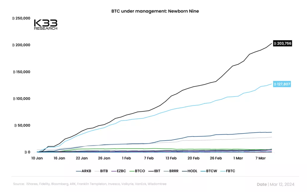 Magdalena Posted March 15, 2024 Posted March 15, 2024 შეერთებულ შტატებში პირველი სპოტ Bitcoin ETF-ების ამოქმედებიდან სულ რაღაც ორი თვის შემდეგ BlackRock-ის IBIT ფონდის AUM-მა - მართვის ქვეშ მყოფი აქტივების მოცულობამ გადააჭარბა 200000 BTC-ს (14.6 მლრდ აშშ დოლარი). Spot Bitcoin ETF-ების რეიტინგი აქტივების მოცულობის მიხედვით. წყარო: BitcoinTreasuries. ცხრა „ახალი“ ETF-ის შესაბამისი მაჩვენებელი (Grayscale-ის „კონვერტირებული“ GBTC-ის გამოკლებით) არის დაახლოებით 420.000 BTC. ეს არის ციფრული ოქროს მთლიანი ემისიის დაახლოებით 2%. "ახალი" Bitcoin ETF-ების AUM-ის დინამიკა. წყარო: K33 Research. მეორე უმსხვილესი AUM-ის მქონე "ახალი" პროდუქტია არის Fidelity-ს FBTC - 128000-ზე მეტი BTC-ით. მას მოსდევს Ark Invest-ის კუთვნილი ARKB - დაახლობით 38000 BTC-ით. გასულ კვირას IBIT-მა გადააჭარბა MicroStrategy-ს, რომელიც ცნობილია თავისი ურყევი პოზიციით პირველ კრიპტოვალუტაში AUM-ის თვალსაზრისით. თუმცა, მაიკლ სეილორის მიერ დაარსებულმა კომპანიამ შეიძინა დამატებითი 12000 BTC. შედეგად, მისმა „ციფრულმა ბალანსმა“ მიაღწია 205000 BTC-ს. საჯარო კომპანიების რეიტინგი Bitcoin-ების რაოდენობის მიხედვით მათ ბალანსზე. წყარო: BitcoinTreasuries. „თუმცა, IBIT სავარაუდოდ მალე გადააჭარბებს ბიზნეს ანალიტიკურ კომპანიას Bitcoin -ის აქტივებით“, - ვარაუდობენ The Block-ის ექსპერტები. Bloomberg-ის ანალიტიკოსმა ჯეიმს სეიფარტმა აღნიშნა, რომ Bitwise-ის ფონდ BITB-ის AUM-მა ახლახანს 2 მლრდ აშშ დოლარს გადააჭარბა. GBTC-ის დაღმავალი დინამიკა ორ თვეში GBTC-ის აქტივების მოცულობა შემცირდა 37%-ით, 619.000 BTC-დან 388.000 BTC-მდე - დიდი ალბათობით, საკომისიოს უფრო მაღალი მაჩვენებლის გამო. ახლა Grayscale-ის სპოტ Bitcoin ETF-ის AUM ოდნავ ნაკლებია მისი კონკურენტების ჯამურ მაჩვენებელთან შედარებით. სეიფარტმა აღნიშნა, რომ ციფრული ოქროს ფასის ზრდამ აანაზღაურა მაჩვენებლის ვარდნა დოლარის თვალსაზრისით - GBTC-ის განკარგულებაში არსებული კრიპტოვალუტის ღირებულება კვლავ 28 მლრდ აშშ დოლარი დარჩა, რაც დაახლოებით იგივეა, რაც კონვერტაციამდე. K33 Research-ის ანალიტიკოსმა ვეტლე ლუნდმა ივარაუდა Grayscale-დან ფონდიდან თანხების გადინების შესუსტება. 11 მარტის მდგომარეობით წმინდა შემოდინებამ აშშ-ის სპოტ Bitcoin ETF-ებში შეადგინა 505.5 მლნ აშშ დოლარი მიუხედავად GBTC-დან 494.1 მლნ აშშ დოლარის გადინებისა. თანხების შემოდინება და გადინება Spot Bitcoin ETF-ებში 11 მარტის მდგომარეობით. წყარო: SoSoValue. ყველაზე დიდი შემოსული თანხები: IBIT — 562.9 მლნ აშშ დოლარი; FBTC — 215.5 მლნ აშშ დოლარი; HODL — 118.9 მლნ აშშ დოლარი; VanEck-ის წარმომადგენლებმა დააწესეს ნულოვანი საკომისიო ETF-ებში თანხების მართვისთვის 2025 წლის 31 მარტამდე, „რადგან მათ ნამდვილად სჯერათ Bitcoin-ის“. The Block-ის მკვლევარების დაკვირვებით IBIT-ში თანხების დღიურმა შემოდინებამ 8 მარტს პირველად გადააჭარბა 10 მლრდ აშშ დოლარს