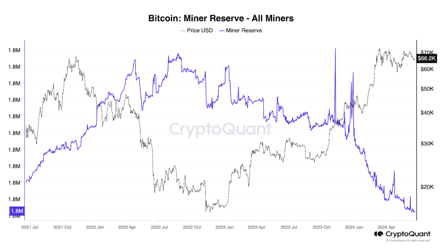 პირველი კრიპტოვალუტის მაინერების რეზერვების შემცირება ზრდის აქტივის მიწოდებას და, შესაბამისად, პოტენციურად უარყოფით ზეწოლას ახდენს მის კოტირებებზე. თუმცა, მაინერების საფულეებში Bitcoin-ების მოცულობა 2023 წლის ოქტომბრიდან იკლებს და მას შემდეგ ციფრული ოქროს ფასი დაახლოებით 150%-ით გაიზარდა.
