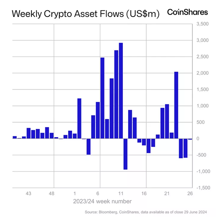 კრიპტო საინვესტიციო პროდუქტებიდან თანხის გადინებამ 22 ივნისიდან 28 ივნისის ჩათვლით პერიოდში შეადგინა 30 მლნ აშშ დოლარი, ერთი კვირით ადრე ანალოგიური მაჩვენებელი 584 მლნ აშშ დოლარი იყო. ასეთ გამოთვლებს აზიარებს CoinShares.
