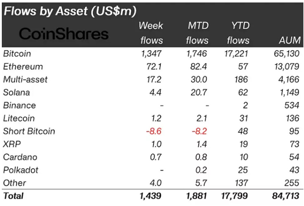 მომხმარებლებმა დაამატეს 1.35 მლრდ აშშ დოლარი Bitcoin-თან დაკავშირებულ პროდუქტებს (ისტორიაში მეხუთე ყველაზე მაღალი მაჩვენებელი), წინა საანგარიშო პერიოდში 398 მლნ აშშ დოლართან შედარებით.