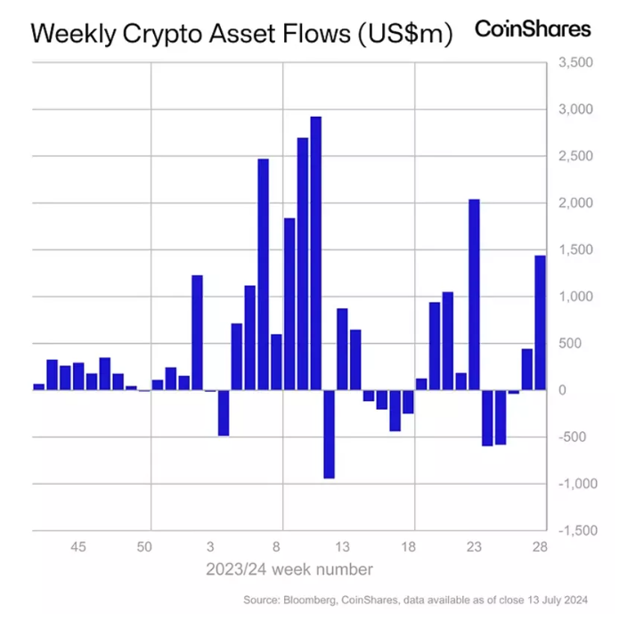კრიპტოვალუტების საინვესტიციო პროდუქტებში თახების შემოდინება 6 ივლისიდან 12 ივლისამდე პერიოდში გაიზარდა 441 მლნ აშშ დოლარიდან 1.44 მლრდ აშშ დოლარამდე. CoinShares-ის თანახმად ეს მაჩვენებელი ისტორიაში სიდიდით მეხუთეა.