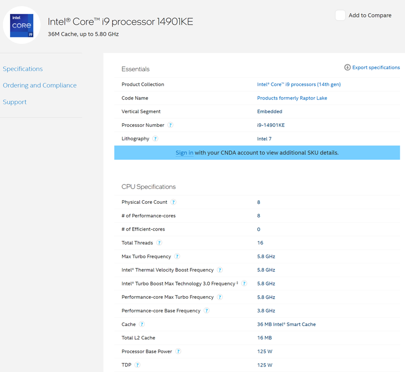 რესურს Wccftech-ის მიხედვით ახალი ხაზის ფლაგმანი Core i9-14901KE. მას აქვს 8 ბირთვი და 16 ნაკადი, საბაზისო ტაქტის სიხშირე 3.8 გჰც და მაქსიმალური სიხშირე ტურბო-რეჟიმში - 5.8 გჰც. ქეშ-მეხსიერების მოცულობაა 36 მბ L3 და 16 მბ L2. TDP/PL1-ის დონეა 125 ვატი. საინტერესოა, რომ პროცესორზე მხარდაჭერილია აჩქარება, რაც არ არის დამახასიათებელი ინტეგრირებული სისტემებისთვის.