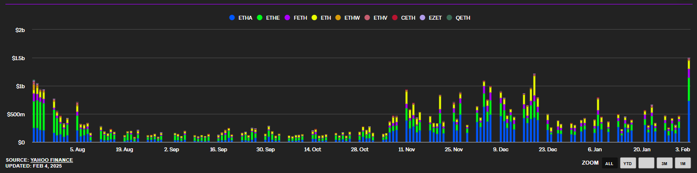 Magdalena Posted February 7, 2025 Posted February 7, 2025 ბოლოდროინდელი ბაზრის კლების ფონზე, ყოველდღიურმა ვაჭრობის მოცულობამ აშშ-ის სპოტ Ethereum ETF-ებში მიაღწია რეკორდულ 1.5 მლრდ აშშ დოლარს. Ethereum ETF ვაჭრობის მოცულობა. წყარო: The Block. წინა მაქსიმუმი 19 დეკემბერს დაფიქსირდა - 1.22 მლრდ აშშ დოლარი. ბრუნვის თვალსაზრისით ლიდერი იყო BlackRock-ის ETHA 736 მლნ აშშ დოლარით. მეორე ადგილი დაიკავა Grayscale-ის ETHE-მ 415 მლნ აშშ დოლარით, ხოლო Fidelity-ის FETH-ზე მოდოდა 155 მლნ აშშ დოლარი. წმინდა შემოდინებამ აშშ-ს ETH ETF-ებში 3 თებერვალს შეადგინა 83.54 მლნ აშშ დოლარი, რაც ყველაზე მაღალია 16 იანვრის შემდეგ. პირველ ადგილზეა FETH 49.75 მილიონით; მეორე ადგილზე - ETHE – 15.85 მლნ აშშ დოლარით, ETH-ში შევიდა 12.75 მილიონი, ხოლო CETH-მა მიიღო 5.19 მლნ აშშ დოლარი. თანხის ჯამური შემოდინება აშშ-ის სპოტ Ethereum ETF-ებში. წყარო: SoSoValue. იმავე დღეს დაფიქსირდა 234.54 მლნ აშშ დოლარის გადინება ამერიკულ სპოტ Bitcoin ფონდებიდან, საიდანაც 177 მლნ აშშ დოლარი მოდიოდა Fidelity-ს კუთვნილ FBTC-ზე. CME-ს ანგარიშის მიხედვით, იანვარში კრიპტო ფიუჩერსების საშუალო დღიური ვაჭრობის მოცულობა იყო 198000, რაც 180%-ით მეტია 2024 წლის ანალოგიურ პერიოდთან შედარებით. ბირჟის სპეციალისტების თქმით ძირითადი წვლილი შეიტანა მიკროკონტრაქტებმა BTC-სა და ETH-ზე, რომლებმაც დააფიქსირეს ბრუნვის ზრდა, 255% და 223%-ით, შესაბამისად. შეგახსენებთ, რომ თებერვალში, Bitwise-ის მთავარმა საინვესტიციო დირექტორმა მეთ ჰოუგანმა ივარაუდა, რომ პირველი კრიპტოვალუტაზე დაფუძნებული Spot ETF გამოიმუშავებს 50 მლრდ აშშ დოლარის შემოდინებას 2025 წელს. https://tinyurl.com/2k6p7tfp Quote