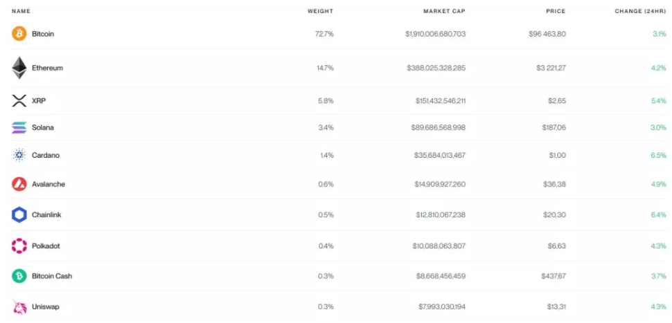 კომპანიის ვებ-გვერდის მიხედვით, Bitwise 10 Crypto Index Fund (BITW) პროდუქტი იკვლევს 10 „ყველაზე ღირებულ, შემოწმებულ კრიპტოვალუტას“, რომლებიც შეწონილია საბაზრო კაპიტალიზაციის მიხედვით. კალათის რებალანსირება ხდება ყოველთვიურად.