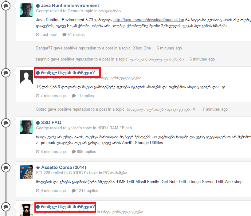 zaqrinio Posted February 7, 2016 Posted February 7, 2016 FB ზე გაგზავნილი ლინკი ფუჭდება მაგის დაწერაც მინდოდა და გადამავიწყდა კარგი იქნება თუ მოაგვარებთ მაგასაც. მართლა კარგად მუშაობს ახლა ფორუმი. მშვენიერია. ერთი ამის შეცვლა თუა შესაძლებელი... არ ვიცი მარტო მე მაწუხებს თუ არა მაგრამ მაინც დავწერ. ამის წინაც დავწერე მარა ახლა უფრო კონკრეტულად დავწერ. All Activity ს რომ ვაწვები ყველა პოსტი ჩანს სათითაოდ და ცოტა შემაწუხებელია 1 გვერდზე ერთი და იგივე თემის რამოდენიმე პოსტი რომ ჩანს. აი მაგალითად ახლა არ შეიძლება რომ 1 გვერდზე მხოლოდ 1 თემის ბოლო პოსტი ჩანდეს ? ანუ ზედიზედ რომ 10 კაცმა დაპოსტოს მაგ თემაში მთლიანი გვერდი 1 თემის პოსტებით აივსება. და ხო კიდევ LOAD MORE ს ნაცვლად რომ გვერდები იყოს უფრო პრაქტიკული იქნება ჩემი აზრით. რომ ვიცოდე რო რაღაც თემა მეათე გვერდზეა პირდაპირ მეათეზე გადავალ და ამ შემთხვევაში 10 ჯერ უნდა დავაჭირო LOAD MORE ს რომ იქამდე მივიდე. და კიდევ ერთი. ONLINE ში მყოფ USER ებს მხოლოდ მთავარ გვერდზე რომ ანახებს უშუალოდ თემაში ვინ არის შესული ეგეც რომ ჩანდეს კარგი იქნებოდა. წინა ძრავზე მაგალითად იყო ეგ და კარგი იყო... Quote