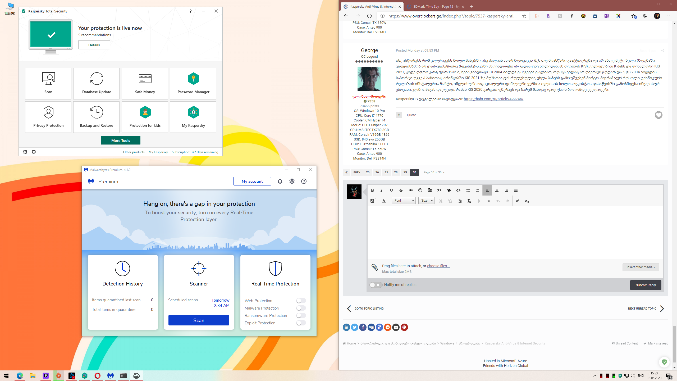 მოკლეთ გამოვიდა KIS 2020 ფინალური ვერსია და დღეს გავაკეთე პირდაპირი აპგრეიდი : https://www.kaspersky.com/downloads/thank-you/internet-security B პაჩი დააყენა და ხოშიანათ უბერავს, რა თქმა უნდა ლიცენზია გადმოყვა მაგ ახალზეც, აი მაინინგ სისტემაზე დროებით 45 დღიანი ტოტალ სეკურიტი დავაყენე, სანამ უფრო გრძელვადიან კლუჩიკს ვიშოვიდე, ბეტა ვერსია აღარ გამიჩერებია და ეგ დავაყენე დღეს, რავი ეგ ახალი მემგონი წინაზე ცოტა უფრო შუსტრი ჩანს, C პაჩი უკვე ბეტა ტესტიროვკას გადის და მოგვიანებით გამოუშვებენ მაგ ახალი ვერსიისთვის